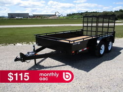 Tandem 3,500 lbs. Axles w/Easy Lube Spindles ST205/75R15 LRD Radial Tires Electric Brakes on Both Axles Slipper Spring Suspension 2-5/16" Adjustable Coupler or 3" Lunette Eye 2,000 lbs. A-frame Jack 4' Split Ramps w/Mesh 14" Solid Steel Side w/ 3" Tie Rail Spare Tire Mount Pressure Treated Wood Floor (6) Welded In D-Rings ((4) on 12') Stake Pockets Powder Coated Sealed Beam L.E.D. Lights and Harness System 7-way RV Plug Transport Canada & DOT Approved Lighting 1 Year Limited Warranty