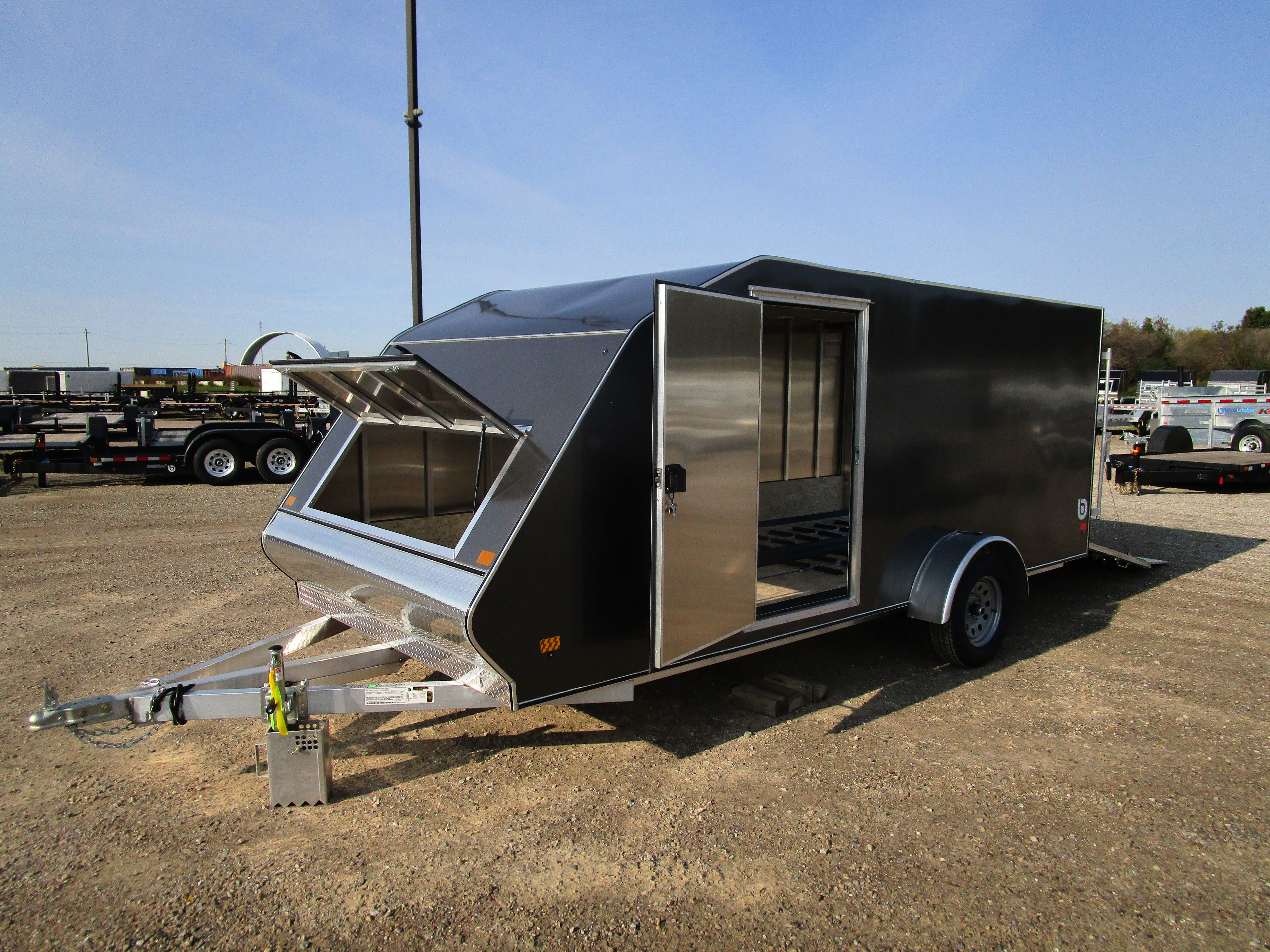 All Aluminum Construction 16" O/C Wall Studs 16" O/C Roof Studs 24" O/C Floor Crossmembers 2" x 4" Subframe Tubing 3500lb Torsion Axle (Tandem 2200lb Torsion Axles on 7.5') 15" Radial Tires on Silver Mod One-Piece Aluminum Roof Rear Ramp Door w/ Spring Assist 5/8" Water Resistant Decking Full Length Slide Track w/ (4) Sliding D-Rings 12" Water Resistant Kickplate 19" x 58" Wide Front Access Door .030 Screwless Exterior Skin Louver Vents Recessed LED Lights Wishbone Tongue w/2" Straight Coupler Round Radius Diamond Plate Nose 1200# Wheel Jack (2) 5000# Safety Chains Interior Dome Light Limited 4-Year Warranty