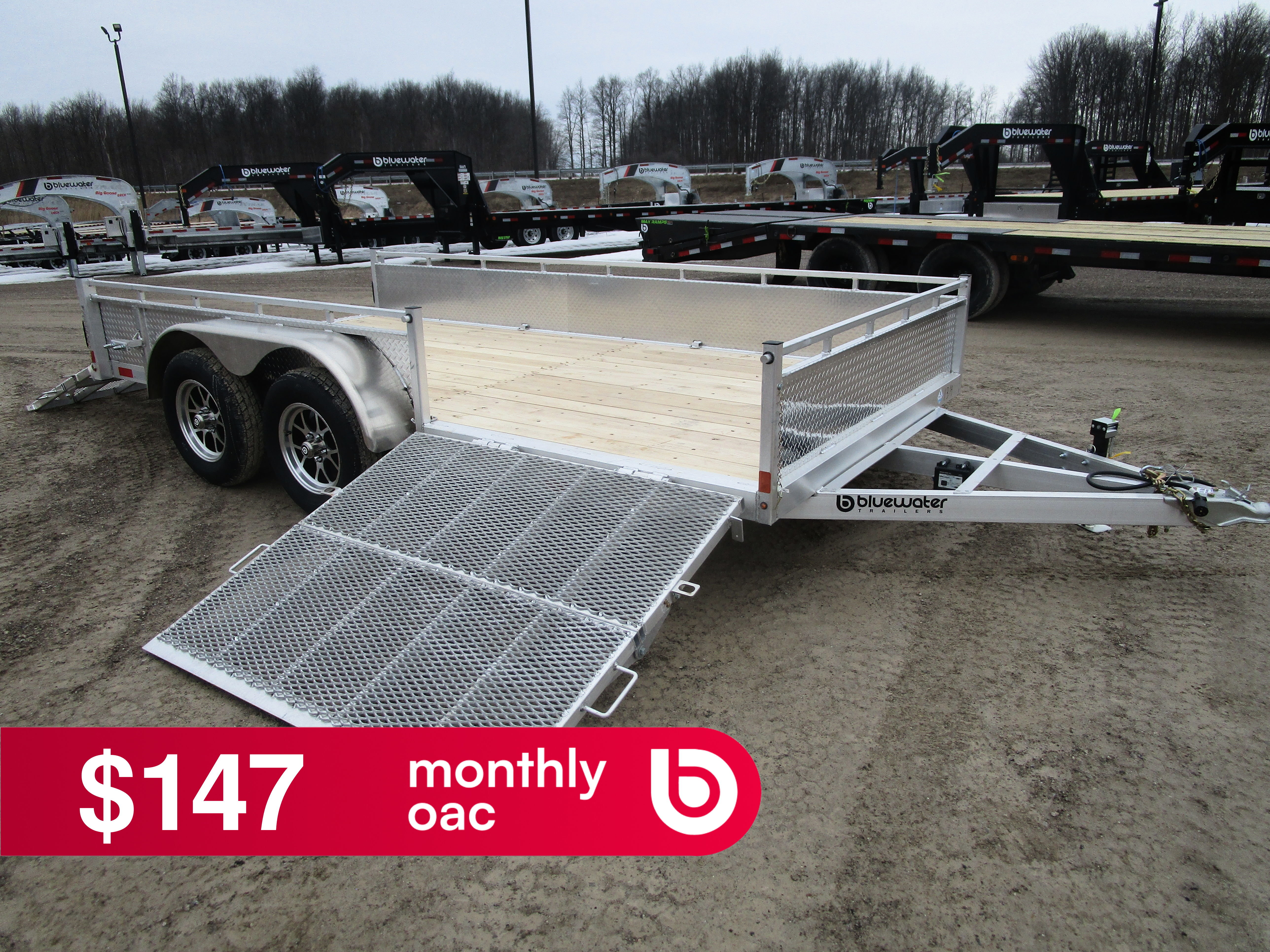 3500lb Axle(s) w/ EZ Lube Hubs Electric Brakes on Tandem Axles All Aluminum Aluminum Tube Frame 16" O.C. Tube Crossmembers Fully Welded Interior Box Wrap Around Tongue 15" Radial Tires w/ Aluminum Rims Heavy Duty Welded Round Smooth Fenders w/Gussets 2000lb Jack 2 5/16" Coupler 6/4 Hardwood Ash Floor Screwed every 16" 15" High Formed .125 ATP Sides + 1.25" Sq. Tube Top Rail Welded in D-Ring Tie Downs ((6) on 8', (8) on 10-14', (10) on 16 and 18', (12) on 20') 4ft High Mesh Ramp Side Load Bifold Ramp Ramp Handles on Both Sides of Ramp License Plate Holder LED Recessed Lighting Fully Sealed Wiring Harness 3 Year Warranty