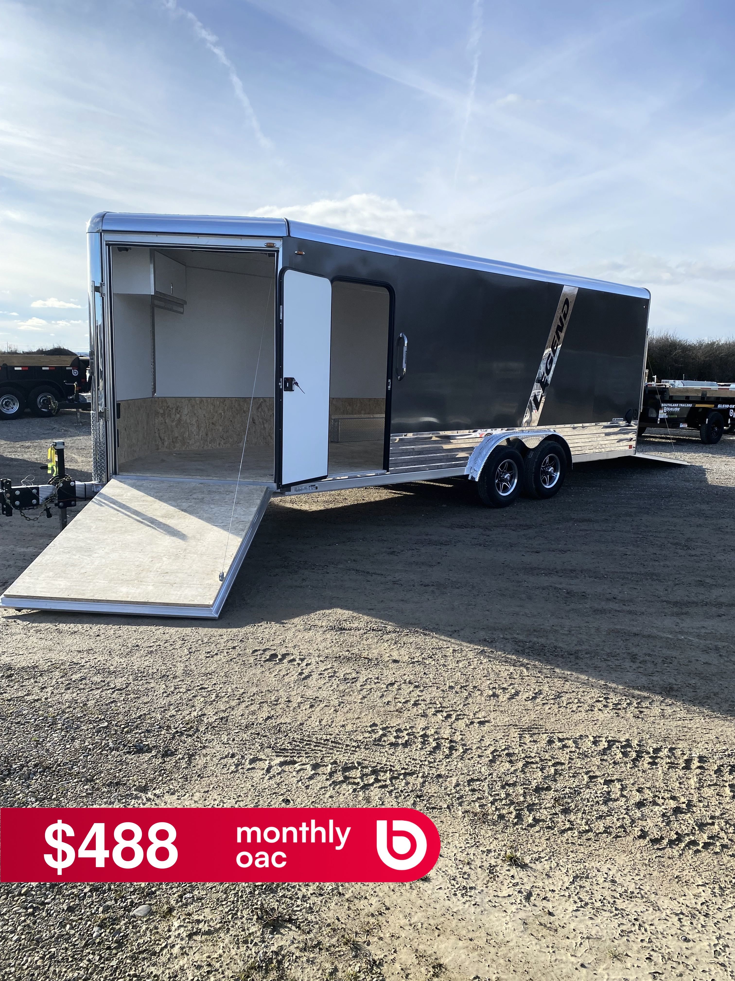 Legend's Deluxe Snow 8' Wide Enclosed Snowmobile Trailer is the ultimate choice for users with a variety of powersports toys. We've taken our #1 selling cargo model, the DVN, and equipped it with an extra foot of nose space, 44" overhead cabinet w/ clothes bar, and a self-mating front ramp door on our 8' wide chassis to create what may be the most flexible enclosed trailer on the market.