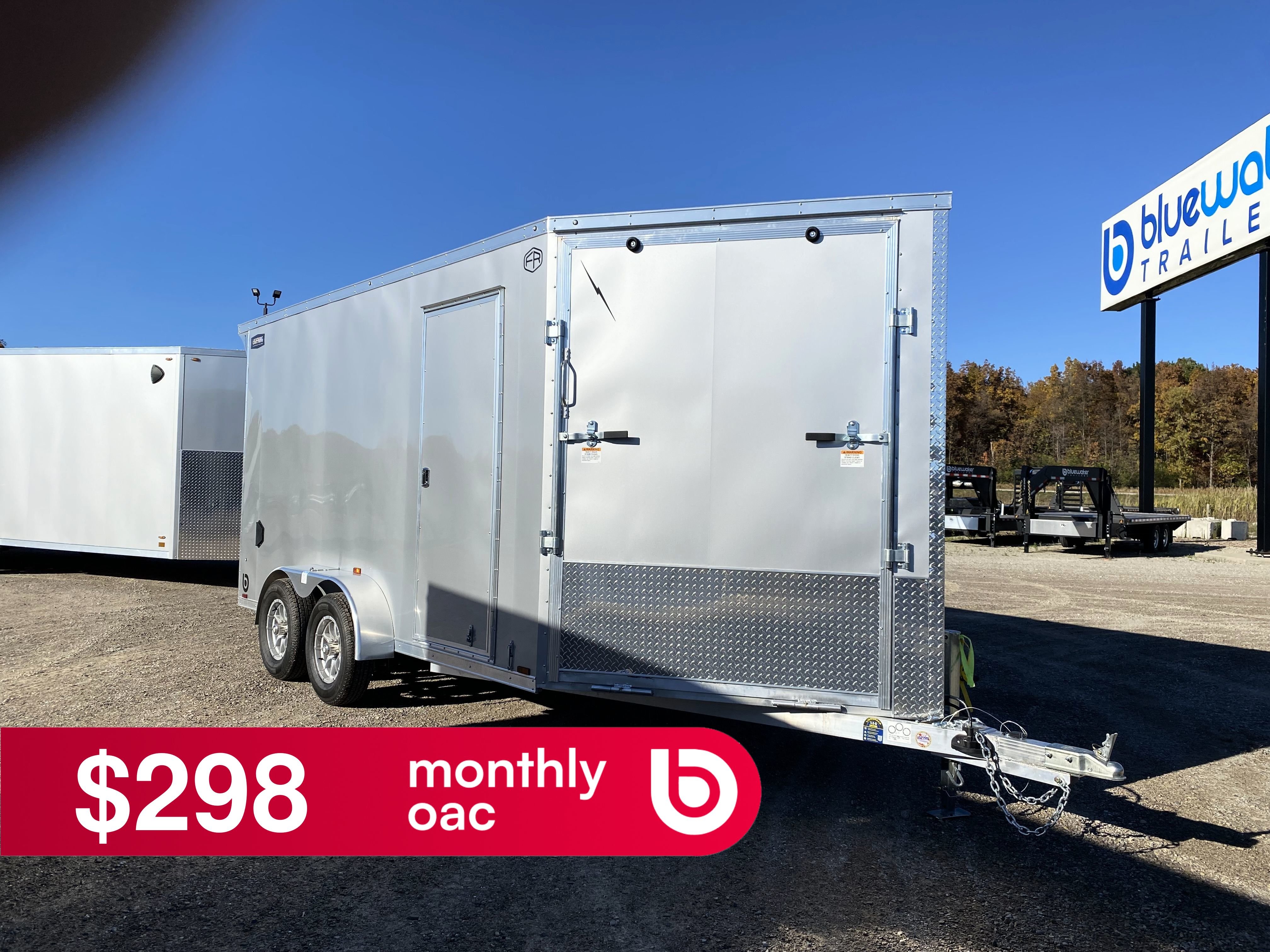 - Lightning Radar Package (White Vinyl Walls, Aluminum Rim Upgrade, 24" Stoneguard Upgrade, Fuel Door (Total of (2) on Models over 19ft), Front & Rear Ramp Door Flaps, 16" OC Floor , 16" OC Ceiling)
