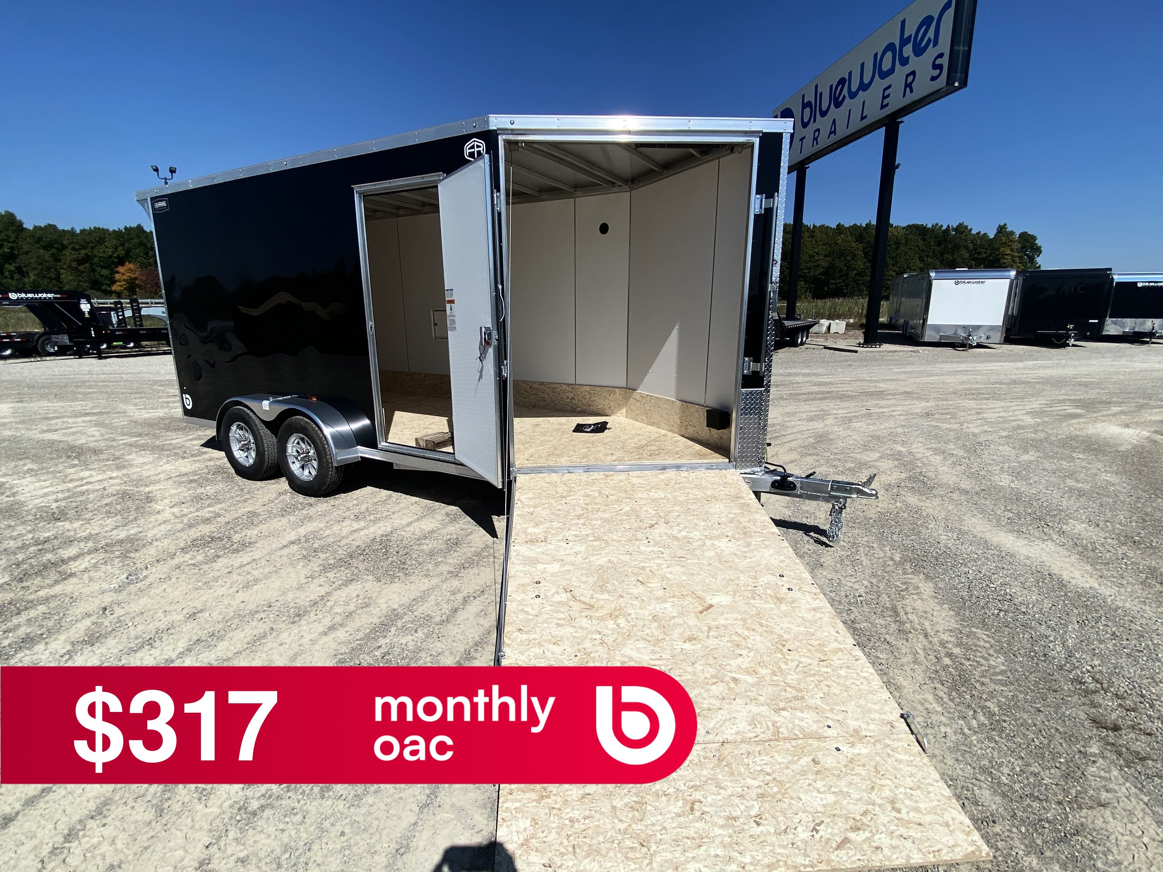 - Lightning Radar Package (White Vinyl Walls, Aluminum Rim Upgrade, 24" Stoneguard Upgrade, Fuel Door (Total of (2) on Models over 19ft), Front & Rear Ramp Door Flaps, 16" OC Floor , 16" OC Ceiling)